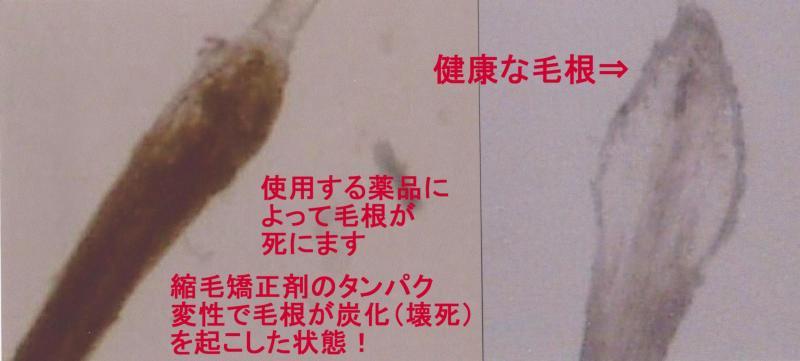 この写真は、縮毛矯正剤が、髪の毛先だけでなく、毛根も破壊され、度重なる施術によって、抜毛や細毛などの原因になるという事です。卵に薬品を混ぜて行った実験結果と同様、毛根側にも逆浸透して根っこを破壊するのだから、毛髪そのものの強度も損なわれ次第に髪のツヤも無くなって行きます。縮毛矯正の施術の際、頭皮や髪の根本1~2cmの部分には薬品は塗布しませんが、髪も木と同様、髪の中心の毛隋から毛根側へ薬品が浸透してしまうのです。怖いですね。だから使用する薬品が、縮毛矯正を行う上で、絶対に外せない条件になるのです。