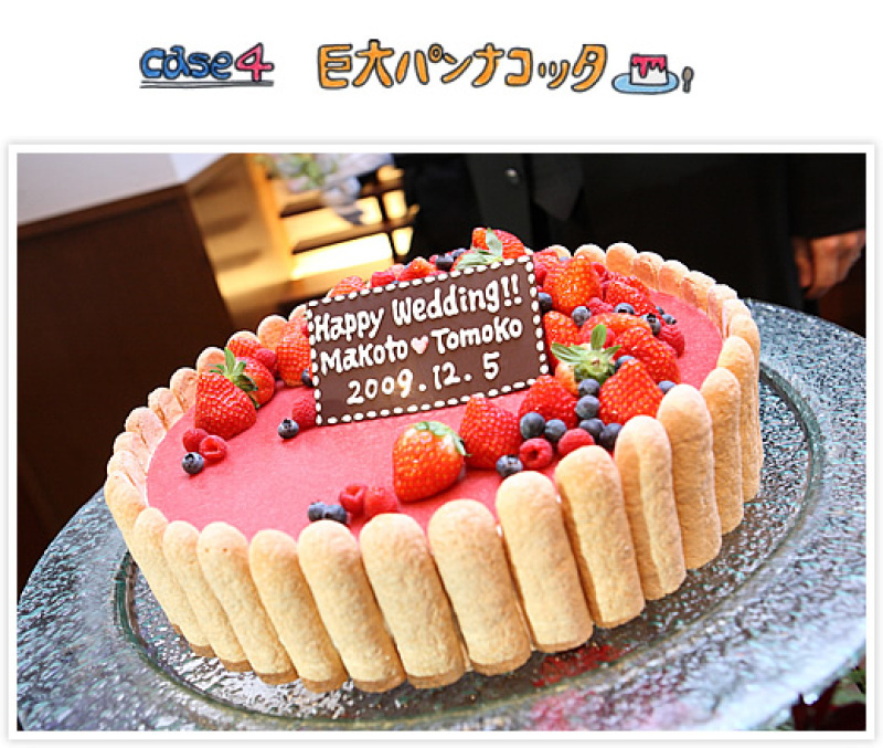 【巨大パンナコッタ!!】 大のパンナコッタ好きの新郎様の為につくられたケーキ。 見た目はふつうのケーキですが、実は中身は巨大なパンナコッタ!!