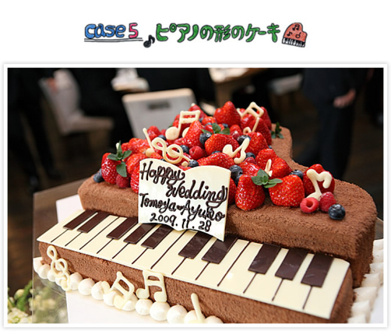 【ピアノの形のケーキ】 ピアノの上にあるMixベリーの中から音符チョコが飛び出す、かわいらしいケーキ♪