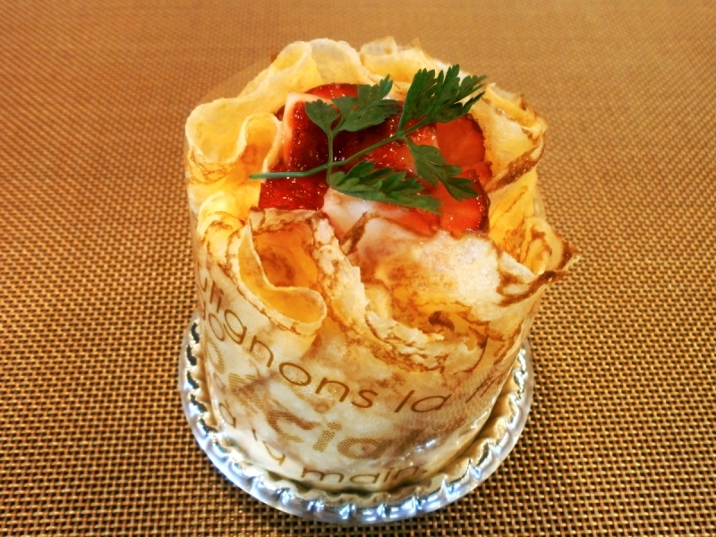 「苺とラズベリーのクレープヨーグルト」¥390 ラズベリーのムース、ヨーグルトムースをクレープで包み苺を沢山のせました。