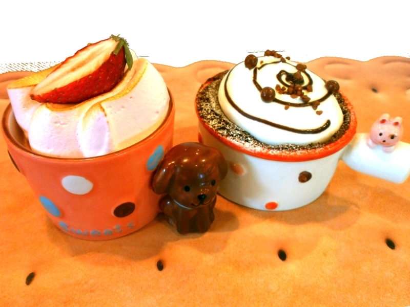 左「大好きいちご」苺とチーズの2色のムースで爽やかさっぱり。 右「デザートショコラ」スフレショコラにたっぷりのフレッシュクリームを絞りました。各¥380